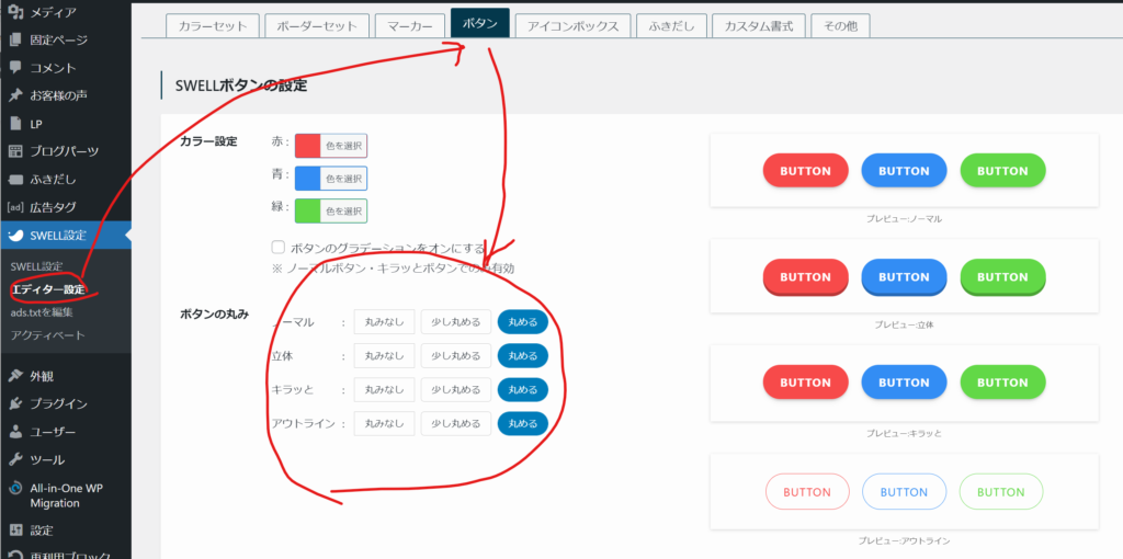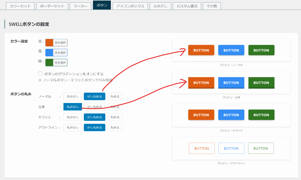 SWELLの「SWELLボタンブロック」を使えば、画像編集ソフトは不要です。 エディターの右側にある設定パネルをポチポチするだけで、色も形も自由自在です。